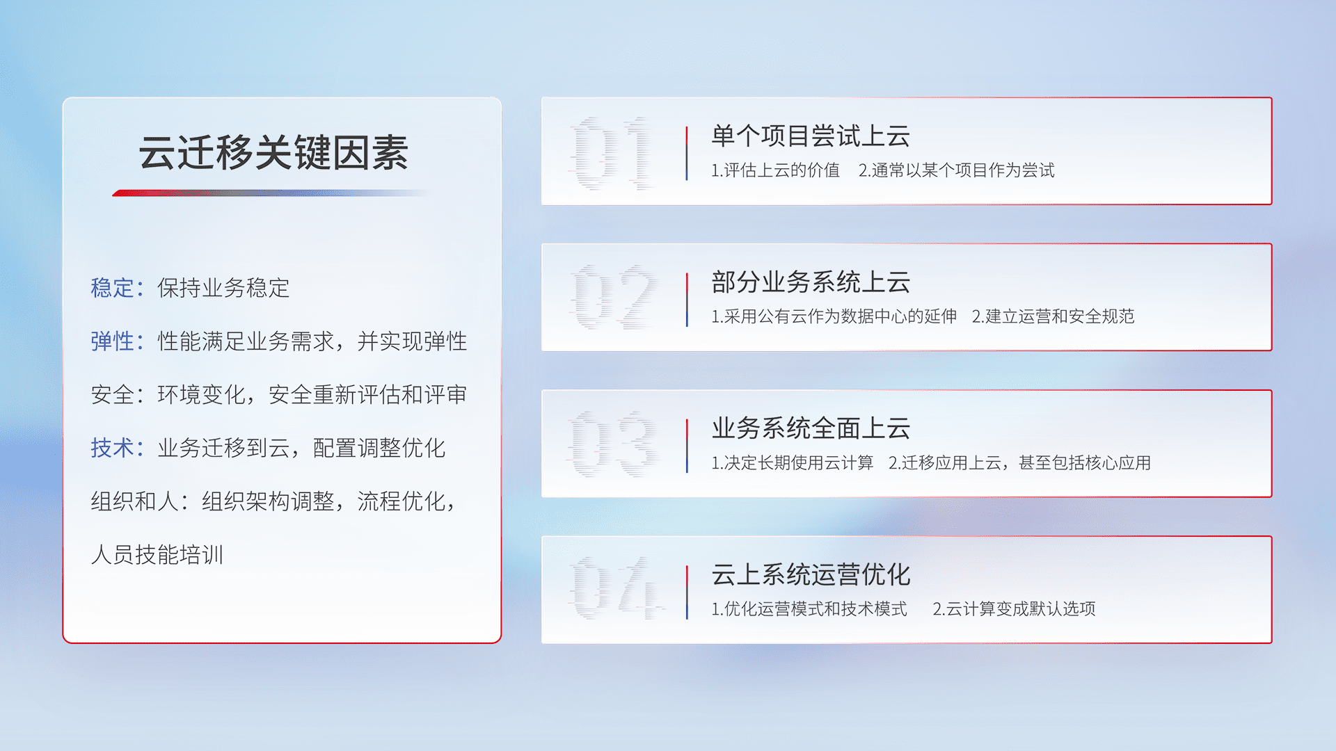结合实际业务,,,从规划设计、、、云平台选型、、、、云原生改造、、数据迁移、、、集成交付,,,,迁移全过程为客户识别最佳上云路径,,,,做好风险识别管理,,设计网络架构、、身份权限、、、安全审计合规、、、操作审计、、、日志审计、、、、监控告警策略、、、、多站点容灾设计等,,,对云上基础设施进行整体规划,,,提升IT治理水平,,以满足弹性、、、、高可用、、、、高性能的需求。。。。