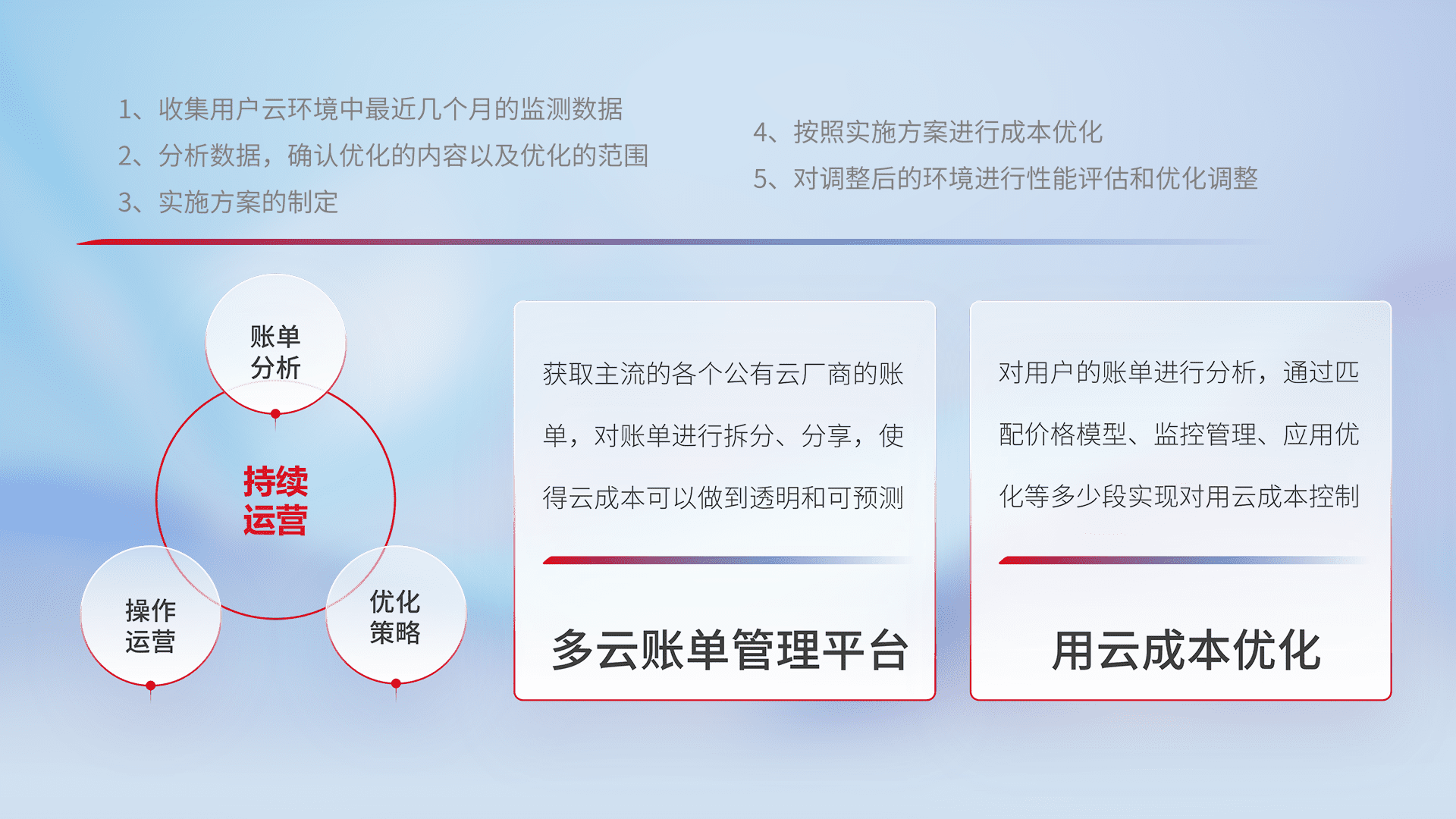 通过多云纳管,,,以统一的资源数据模型把客户的云资源进行抽象和封装,,,,进而实现对多云资源的统一操作,,保障云资源管理的可靠性、、、、稳定性与可用性。。量身定制化运维内容,,,,配置、、、、开发运维、、、、补丁管理、、、、备份、、、监控、、、认证和访问管理、、、审计和日常巡检等,,,,保障在用云过程中的可靠度,,,稳定度以及高可用率。。。。