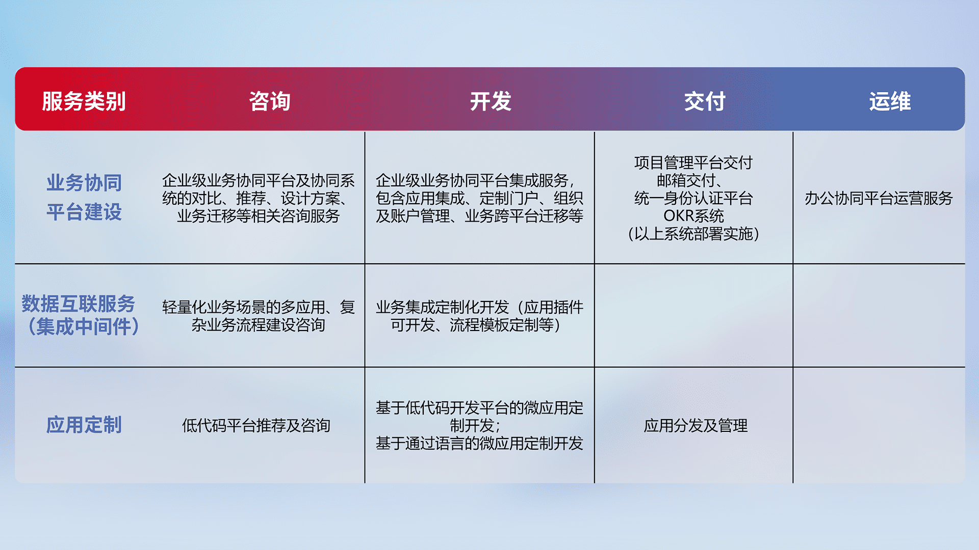 针对钉钉、、、企微、、IDaas等平台级产品提供产品的规划、、方案、、、、交付、、定制化开发等服务,,,实现如统一协同办公、、智能客户服务、、混合会议管理、、、智能数据查询、、、、等业务场景,,实现数字化转型。。